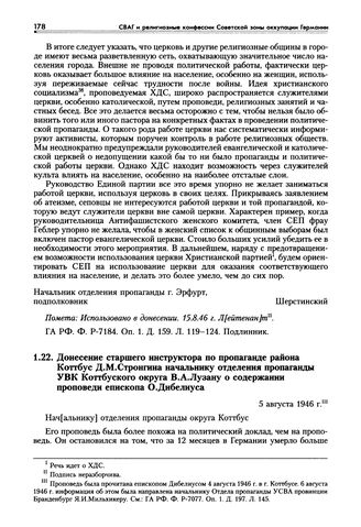 Донесение старшего инструктора по пропаганде района Коттбус Д.М. Стронгина начальнику отделения пропаганды УВК Коттбуского округа В.А. Лузану о содержании проповеди епископа О. Дибелиуса. 5 августа 1946 г. // ГА РФ. Ф. Р-7077. Оп. 1. Д. 197. Л. 146. Подлинник.