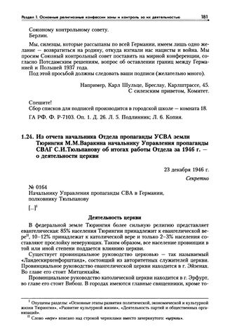 Из отчета начальника Отдела пропаганды УСВА земли Тюрингия М.М. Варакина начальнику Управления пропаганды СВАГ С.И. Тюльпанову об итогах работы Отдела за 1946 г. — о деятельности церкви. 23 декабря 1946 г.