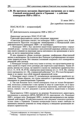 Из протокола заседания Директората внутренних дел и связи Союзной контрольной власти в Германии — о действии конкордатов 1929 и 1933 гг. 21 июня 1947 г. // ГА РФ. Ф. Р-7317. Оп. 18. Д. 48. Л. 145-146. Копия.