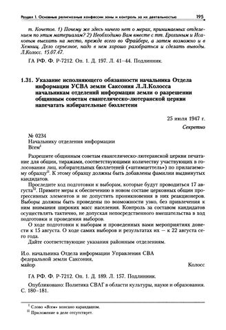 Указание исполняющего обязанности начальника Отдела информации УСВА земли Саксония Л.Л. Колосса начальникам отделений информации земли о разрешении общинным советам евангелическо-лютеранской церкви напечатать избирательные бюллетени. 25 июля 1947 г.