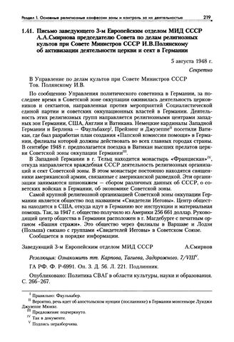 Письмо заведующего 3-м Европейским отделом МИД СССР А.А. Смирнова председателю Совета по делам религиозных культов при Совете Министров СССР И.В. Полянскому об активизации деятельности церкви и сект в Германии. 5 августа 1948 г. // ГА РФ. Ф. Р-6991. Оп. 3. Д. 56. Л. 221. Подлинник. Опубликовано: Политика СВАГ в области культуры, науки и образования. С. 266-267.