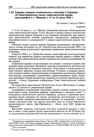 Справка аппарата политического советника в Германии об общегерманском съезде евангелической церкви, проходившем в г. Эйзенахе с 11 по 14 июля 1948 г. Не позднее 7 августа 1948 г. // ГА РФ. Ф. Р-6991. Оп. 3. Д. 56. Л. 222-232. Подлинник.