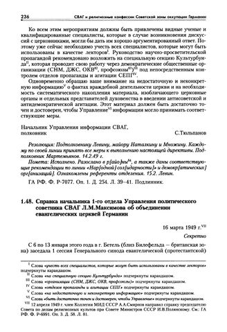 Справка начальника 1-го отдела Управления политического советника СВАГ Л.М. Максимова об объединении евангелических церквей Германии. 16 марта 1949 г. // ГА РФ. Ф. Р-6991. Оп. 3. Д. 58. Л. 82-87. Заверенная копия. Опубликовано: Политика СВАГ в области культуры, науки и образования. С. 290-292.