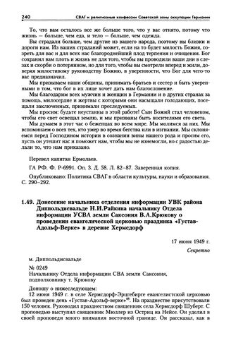 Донесение начальника отделения информации УВК района Диппольдисвальде Н.И. Райкина начальнику Отдела информации УСВА земли Саксония В.А. Крюкову о проведении евангелической церковью праздника «Густав-Адольф-Верке» в деревне Хермсдорф. 17 июня 1949 г. // ГА РФ. Ф. Р-7212. Оп. 1. Д. 256. Л. 132. Подлинник.