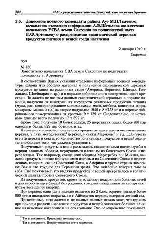 Донесение военного коменданта района Ауэ М.П. Ткаченко, начальника отделения информации А.В. Шатилова заместителю начальника УСВА земли Саксония по политической части П.Ф. Артемьеву о распределении евангелической церковью продуктов питания и вещей среди населения. 2 января 1949 г.