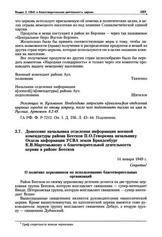 Донесение начальника отделения информации военной комендатуры района Беесков П.О. Геворкяна начальнику Отдела информации УСВА земли Бранденбург К.В. Мартемьянову о благотворительной деятельности церкви в районе Беесков. 14 января 1949 г. // ГА РФ. Ф. Р-7077. Оп. 1. Д. 254. Л. 23-24. Подлинник.