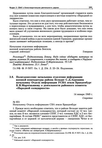 Политдонесение начальника отделения информации военной комендатуры района Бельциг С.Д. Ахромина начальнику Отдела информации УСВА земли Бранденбург К.В. Мартемьянову о деятельности районного комитета «Народной солидарности». 14 января 1949 г. // ГА РФ. Ф. Р-7077. Оп. 1. Д. 254. Л. 1-3. Подлинник.