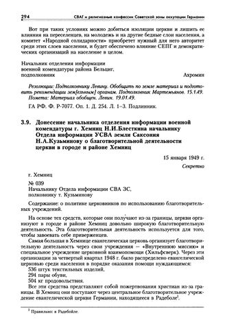 Донесение начальника отделения информации военной комендатуры г. Хемниц Н.И. Блесткина начальнику Отдела информации УСВА земли Саксония Н.А. Кузьминову о благотворительной деятельности церкви в городе и районе Хемниц. 15 января 1949 г. // ГА РФ. Ф. Р-7212. Оп. 1. Д. 256. Л. 15-18. Подлинник.