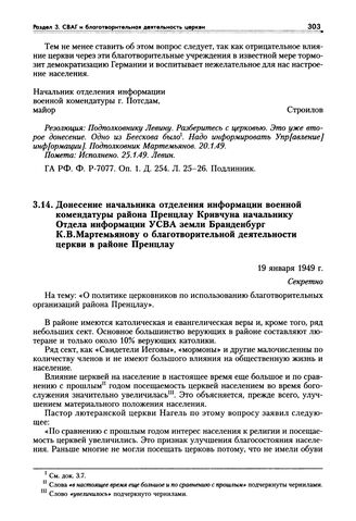 Донесение начальника отделения информации военной комендатуры района Пренцлау Кривчуна начальнику Отдела информации УСВА земли Бранденбург К.В. Мартемьянову о благотворительной деятельности церкви в районе Пренцлау. 19 января 1949 г.