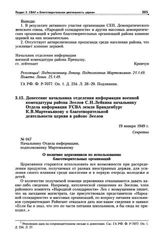 Донесение начальника отделения информации военной комендатуры района Зеелов С.Н. Лейкина начальнику Отдела информации УСВА земли Бранденбург К.В. Мартемьянову о благотворительной деятельности церкви в районе Зеелов. 19 января 1949 г. // ГА РФ. Ф. Р-7077. Оп. 1. Д. 254. Л. 30-31. Подлинник.