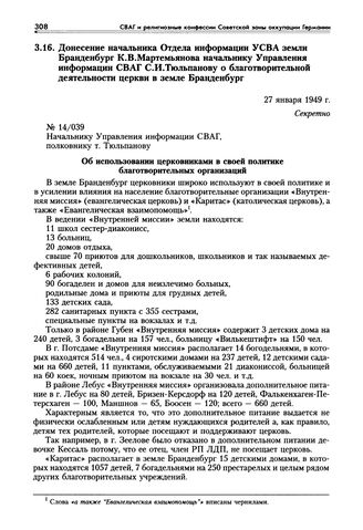 Донесение начальника Отдела информации УСВА земли Бранденбург К.В. Мартемьянова начальнику Управления информации СВАГ С.И. Тюльпанову о благотворительной деятельности церкви в земле Бранденбург. 27 января 1949 г. // ГА РФ. Ф. Р-7077. Оп. 1. Д. 254. Л. 34-38. Подлинник.