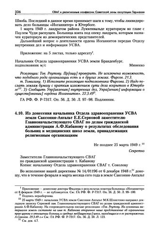 Из донесения начальника Отдела здравоохранения УСВА земли Саксония-Ангальт Е.Е. Серковой заместителю Главноначальствующего СВАГ по делам гражданской администрации А.Ф. Кабанову о результатах обследования больниц и медицинских школ земли, принадлежащих религиозным организациям. Не позднее 25 марта 1949 г.