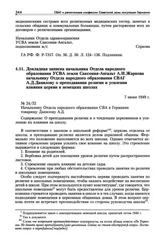 Докладная записка начальника Отдела народного образования УСВА земли Саксония-Ангальт А.И. Жаркова начальнику Отдела народного образования СВАГ А.Д. Данилову о преподавании религии и усилении влияния церкви в немецких школах. 7 июня 1949 г. // ГА РФ. Ф. Р-7317. Оп. 55. Д. 7. Л. 71-75. Подлинник. Опубликовано: Политика СВАГ в области культуры, науки и образования. С. 305-308.