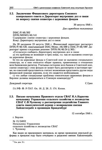 Заключение Финансового директората Союзного контрольного совета в Директорат внутренних дел и связи по вопросу снятия секвестра с церковных фондов. 30 августа 1946 г. // ГА РФ. Ф. Р-7317. Оп. 18. Д. 26. Л. 174. Копия.