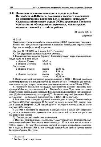 Донесение военного коменданта города и района Виттенберг А.И. Пирога, помощника военного коменданта по экономическим вопросам Г.И. Потапенко начальнику Сельскохозяйственного отдела УСВА провинции Саксония о результатах обследования церковных, монастырских, городских имений и хозяйств района. 21 марта 1947 г.