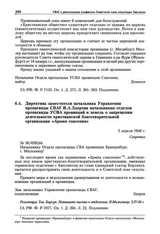 Директива заместителя начальника Управления пропаганды СВАГ В.А. Здорова начальникам отделов пропаганды УСВА провинций и земель о запрещении деятельности христианской благотворительной организации «Армия спасения». 2 апреля 1946 г.