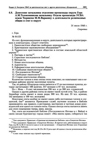 Донесение начальника отделения пропаганды округа Гера А.М. Толоконникова начальнику Отдела пропаганды УСВА земли Тюрингия М.М. Варакину о деятельности религиозных общин и сект в округе. 31 июля 1946 г. // ГА РФ. Ф. Р-7184. Оп. 1. Д. 159. Л. 116-118. Подлинник.