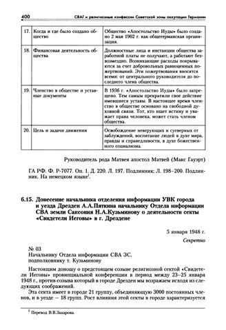 Донесение начальника отделения информации УВК города и уезда Дрезден А.А. Пяткина начальнику Отдела информации СВА земли Саксония Н.А. Кузьминову о деятельности секты «Свидетели Иеговы» в г. Дрездене. 5 января 1948 г.