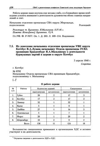 Из донесения начальника отделения пропаганды УВК округа Коттбус В.А. Лузана начальнику Отдела пропаганды УСВА провинции Бранденбург Я.А. Мильхикеру о деятельности буржуазных партий и церкви в округе Коттбус. 5 апреля 1946 г. // ГА РФ. Ф. Р-7077. Оп. 1. Д. 203. Л. 100, 105-108. Подлинник.