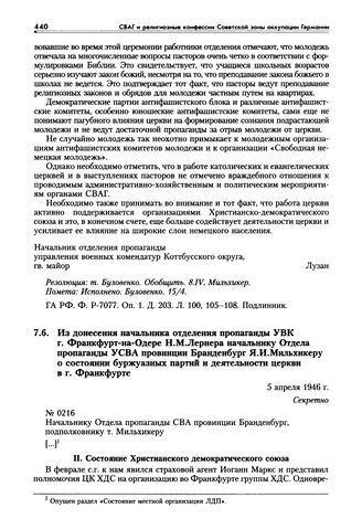 Из донесения начальника отделения пропаганды УВК г. Франкфурт-на-Одере Н.М. Лернера начальнику Отдела пропаганды УСВА провинции Бранденбург Я.И. Мильхикеру о состоянии буржуазных партий и деятельности церкви в г. Франкфурте. 5 апреля 1946 г. // ГА РФ. Ф. Р-7077. Оп. 1. Д. 203. Л. 88-92. Подлинник.