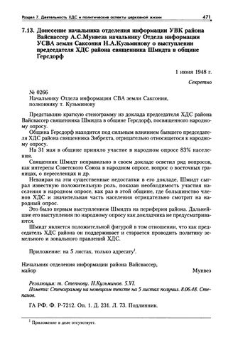 Донесение начальника отделения информации УВК района Вайсвассер А.С. Мунвеза начальнику Отдела информации УСВА земли Саксония Н.А. Кузьминову о выступлении председателя ХДС района священника Шмидта в общине Герсдорф. 1 июня 1948 г.