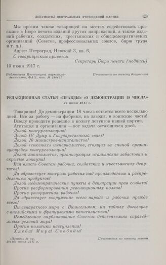 Редакционная статья «Правды» «о демонстрации 18 числа». 16 июня 1917 г. // «Правда» № 83, 29(16) июня 1917 г.