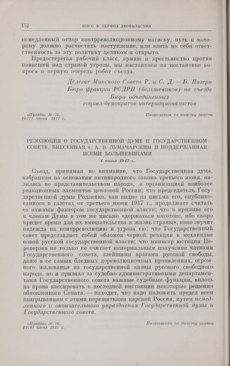 Проекты резолюций и заявления, внесенные на I Всероссийском съезде Советов рабочих и солдатских депутатов. 3-24 июня. Резолюция о Государственной Думе и Государственном Совете, внесенная т. А.В. Луначарским и поддержанная всеми большевиками. 4 июн...