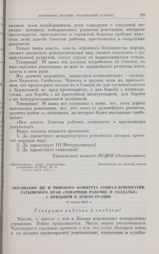 Обращение ЦК и Рижского комитета социал-демократии Латышского края «Товарищи рабочие и солдаты!» с призывом к демонстрации. 18 июня 1917 г.