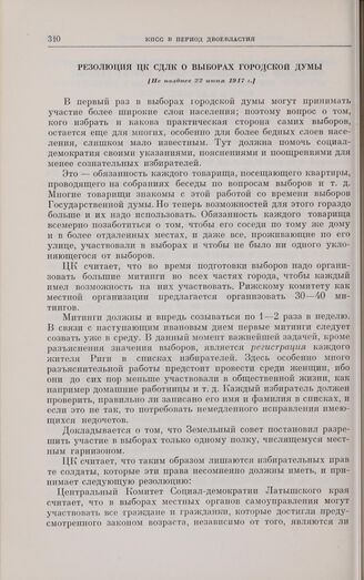 Резолюция ЦК СДЛК о выборах городской думы. [Не позднее 22 июня] 1917 г. // «Циня» («Борьба») № 34, 22(5) июня 1917 г.