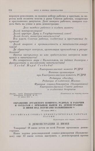 Обращение Луганского комитета РСДРП(б) к рабочим и солдатам с призывом выйти на демонстрацию 25 июня под лозунгами большевиков. 25 июня 1917 г.