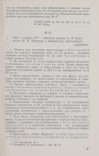 1811 г. ноября 15. — Краткая записка А. Я. Коронелли М. И. Кутузову о задунайских переселенцах // ЦГВИА СССР, ф. МА, оп. 166, св. 34, д. 17, лл. 61—66. Копия.