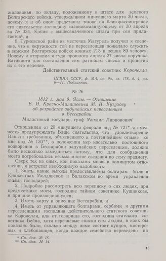 1812 г. мая 9. Яссы. — Отношение В. И. Красно-Милашевича М. И. Кутузову об устройстве задунайских переселенцев в Бессарабии // ЦГВИА СССР, ф. МА, оп. 166, св. 34, д. 17, лл. 7—40. Подлинник.