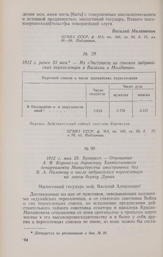 1812 г. ранее 23 мая. — Из «Экстракта из списков задунайских переселенцев в Валахии и Молдавии» // ЦГВИА СССР. ф. МА, оп. 166, св. 34, д. 17, л. 70, об. Подлинник.