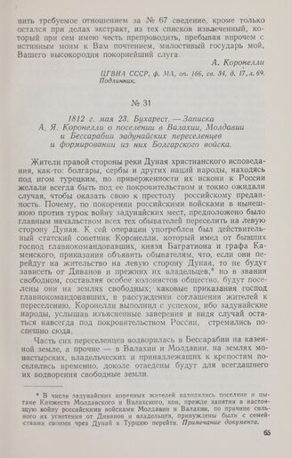 1812 г. мая 23. Бухарест. — Записка А. Я. Коронелли о поселении в Валахии, Молдавии и Бессарабии задунайских переселенцев и формировании из них Болгарского войска // ЦГВИА СССР, ф. МА, оп. 166, св. 34, д. 17, лл. 71—73. Подлинник.