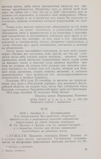 1814 г. декабря 9. — Постановление 2-го департамента Бессарабского областного правительства о разрешении перехода задунайских переселенцев из одной деревни помещика И. Гр. Бальша в другую, ему же принадлежащую, и о принятии строгих мер против самовольно переходящих на казенные земли // ЦГИА МССР, ф. 5, оп. 2, д. 139, лл. 51 об. — 53. Подлинник.