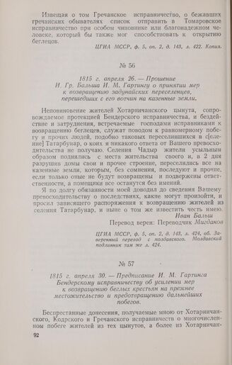 1815 г. апреля 26. — Прошение И. Гр. Бальша И. М. Гартингу о принятии мер к возвращению задунайских переселенцев, перешедших с его вотчин на казенные земли // ЦГИА МССР, ф. 5, оп. 2, д. 143, л. 424, об. Заверенный перевод с молдавского. Молдавский подлинник там же л. 424.