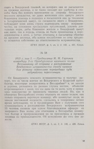1815 г. мая 5. — Предписание И. М. Гартинга командиру 2-го Оренбургского казачьего полка Ветошникову об отправке в распоряжение Бендерского исправничества отряда казаков для розыска самовольно перешедших туда задунайских переселенцев // ЦГИА МССР, ф. 5, оп. 2, д. 143, л. 426. Копия.