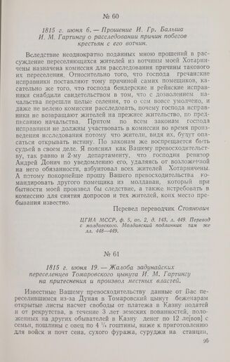 1815 г. июня 19. — Жалоба задунайских переселенцев Томаровского цынута И. М. Гартингу на притеснения и произвол местных властей // ЦГИА МССР, ф. 38, оп. 1, д. 4, лл. 8—9. Подлинник.