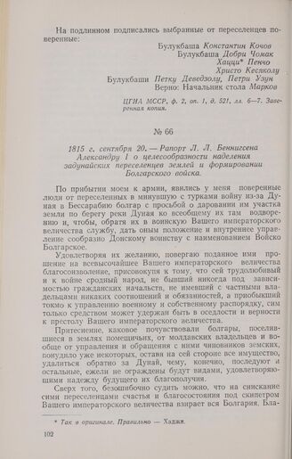 1815 г. сентября 20. — Рапорт Л. Л. Беннигсена Александру I о целесообразности наделения задунайских переселенцев землей и формировании Болгарского войска // ЦГИА МССР, ф. 2, оп. 1, д. 521, л. 8. Заверенная копия.