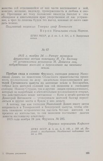 1815 г. ноября 24. — Рапорт экономии фрумосских вотчин помещику И. Гр. Бальшу об установлении ревизором М. Доничем лиц, побуждавших жителей к переселению на казенные земли // ЦГИА МССР, ф. 5, оп. 2, д. 143, л. 503 об. Перевод с молдавского. Молдавский подлинник там же л. 503.