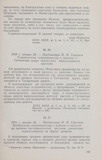 1816 г. января 24. — Предписание И. М. Гартинга Томаровскому исправничеству о высылке в Гречанский цынут самовольно переселившихся крестьян // ЦГИА МССР, ф. 5, оп. 2, д. 143, л. 532 об. Перевод с молдавского. Молдавский подлинник там же л. 532.