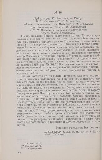 1816 г. марта 13. Кишинев. — Рапорт И. М. Гартинга Л. Л. Беннигсену об откомандировании им Милетича и И. Марченко для сбора совместно с А. П. Юшневским и Д. П. Ватикиоти сведений о задунайских переселенцах Бессарабии // ЦГВИА СССР, ф. МА, оп. 183, св. 25, д. 22, лл. 14—15. Подлинник.