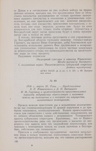 1816 г. марта 20. Рени. — Представление А. П. Юшневского и Д. П. Ватикиоти И. М. Гартингу о целесообразности приостановления перевода задунайских переселенцев с казенных земель на помещичьи и о возврате им имущества захваченного помещиками // ЦГВИА СССР, ф. МА, оп. 183, св. 25. д. 22, лл. 17—18. Заверенная копия с копии.
