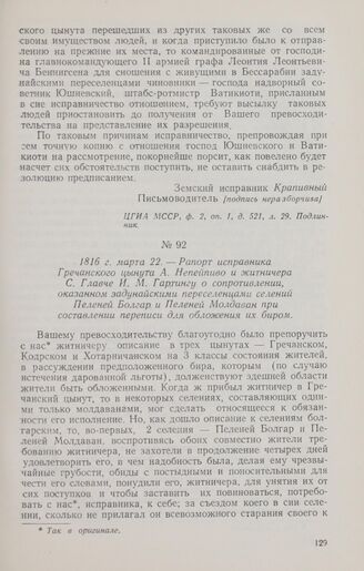 1816 г. марта 22. — Рапорт исправника Гречанского цынута А. Непейпиво и житничера С. Главче И. М. Гартингу о сопротивлении, оказанном задунайскими переселенцами селений Пеленей Болгар и Пеленей Молдаван при составлении переписи для обложения их биром // ЦГИА МССР, ф. 2, оп. 1, д. 401, лл. 105—108. Подлинник.