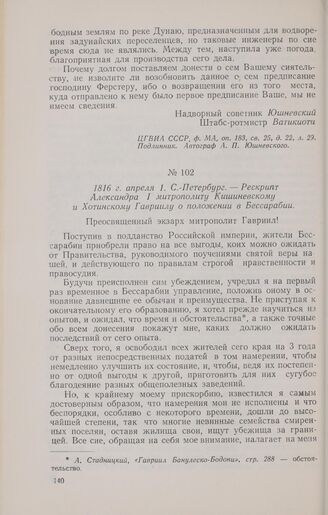 1816 г. апреля 1. С.-Петербург. — Рескрипт Александра I митрополиту Кишиневскому и Хотинскому Гавриилу о положении в Бессарабии // ЦГИА МССР, ф. 5, оп. 2, д. 308, л. 178. Печатная копия. Опублик. А. Стадницким в монографии «Гавриил Банулеско-Бодони экзарх молдовлахийский (1808—1812 гг.) и митрополит кишиневский (1813—21 гг.)», Кишинев, 1894, стр. 288—290.