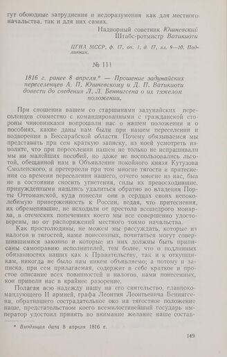 1816 г. ранее 8 апреля. — Прошение задунайских переселенцев А. П. Юшневскому и Д. П. Ватикиоти довести до сведения Л. Л. Беннигсена о их тяжелом положении // ЦГИА МССР, ф. 17, оп. 1, д. 17, лл. 59—60. Подлинник.