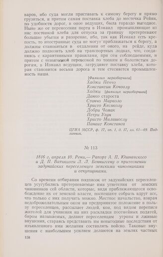 1816 г. апреля 10. Рени. — Рапорт А. П. Юшневского и Д. П. Ватикиоти Л. Л. Беннигсену о притеснении задунайских переселенцев земскими чиновниками и откупщиками // ЦГИА МССР, ф. 17, оп. 1, д. 17, лл. 11—14. Подлинник. Автограф А. П. Юшневского.