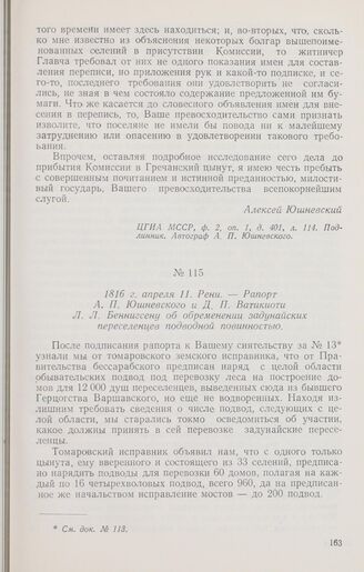 1816 г. апреля 11. Рени. — Рапорт А. П. Юшневского и Д. П. Ватикиоти Л. Л. Беннигсену об обременении задунайских переселенцев подводной повинностью // ЦГИА МССР, ф. 17, оп. 1, д. 17, лл. 15—16. Подлинник. Автограф А. П. Юшневского.