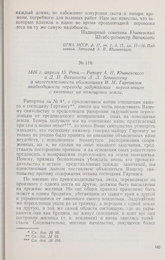 1816 г. апреля 15. Рени. — Рапорт А. П. Юшневского и Д. П. Ватикиоти Л. Л. Беннигсену о несостоятельности обоснования И. М. Гартингом необходимости перевода задунайских переселенцев с казенных на помещичьи земли // ЦГИА МССР, ф. 17, оп. 1, д. 17, лл. 17—20. Подлинник. Автограф А. П. Юшневского.