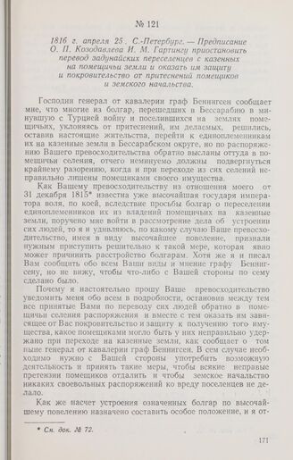 1816 г. апреля 25. С.-Петербург. — Предписание О. П. Козодавлева И. М. Гартингу приостановить перевод задунайских переселенцев с казенных на помещичьи земли и оказать им защиту и покровительство от притеснений помещиков и земского начальства // ЦГИА МССР, ф. 2, оп. 1, д. 521, лл. 52—53. Подлинник.